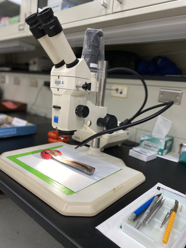 This lab has a library of lead pipe samples from different cities across the nation, which were collected and studied to provide technical support to states and communities related to the Lead and Copper Rule (LCR). These pipe samples were studied to gain further information about the specific chemistry impacting each city’s lead pipes. Reporters viewed cross sections of some of these pipes displayed under a microscope to examine the lead scales.