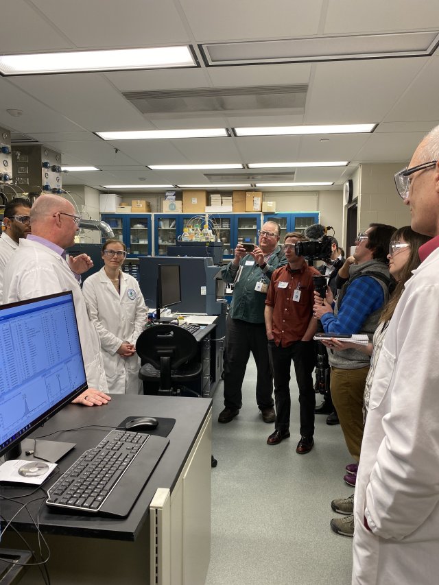 Next, EPA researchers in the Advanced Materials and Solids Analysis Resource Core (AMSARC) Laboratory spoke to the reporters about lead pipes. This lab is the foundation for EPA's solids and surfaces analysis capabilities; the tour featured state-of-the-art analytical equipment that supports various projects, including water quality research, corrosion control, green chemistry, bacteria and nanomaterials characterization, arsenic removal from drinking water, and many others.
