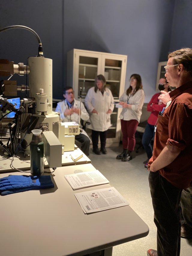 The tour concluded in Cincinnati’s Full Containment Facility, a self-contained and environmentally isolated research facility designed for analytical and experimental research on highly toxic or hazardous materials. This facility is next to the main building and includes several labs with capacities to analyze and characterize unknown waste samples and to conduct laboratory-scale treatment and treatment-related research. The Full Containment Facility includes extremely sensitive electron microscopes, which are situated over bedrock to reduces floor movement and create a clear image at intense magnification.