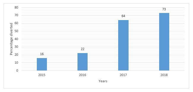 Adams 12 has added access to hard-to-recycle streams such as alkaline batteries, printer cartridges and toner, electronics, light bulbs, and bulk metals. The district also grew its cafeteria composting program from five schools at the start of the 2018–2019 school year to nine schools at the end of the 2019–2020 school year. The district-wide diversion rate increased from 17.8 percent in 2018 to 21.3 percent in 2019. The district also reduced its total municipal and hard-to-recycle waste streams from 2,960.4 tons in 2018 to 2,701.6 tons in 2019. This reflects a nearly 15 percent reduction in total waste going to the landfill, a seven percent increase in recycling tonnage, and nearly doubling of compost tonnage.