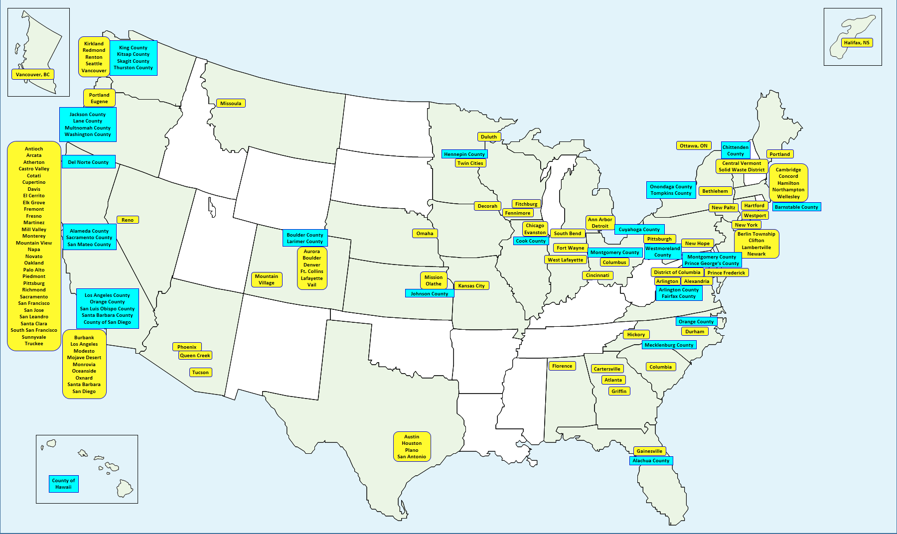 This map shows all of the cities and counties with featured examples available in this tool. Click the image to enlarge.