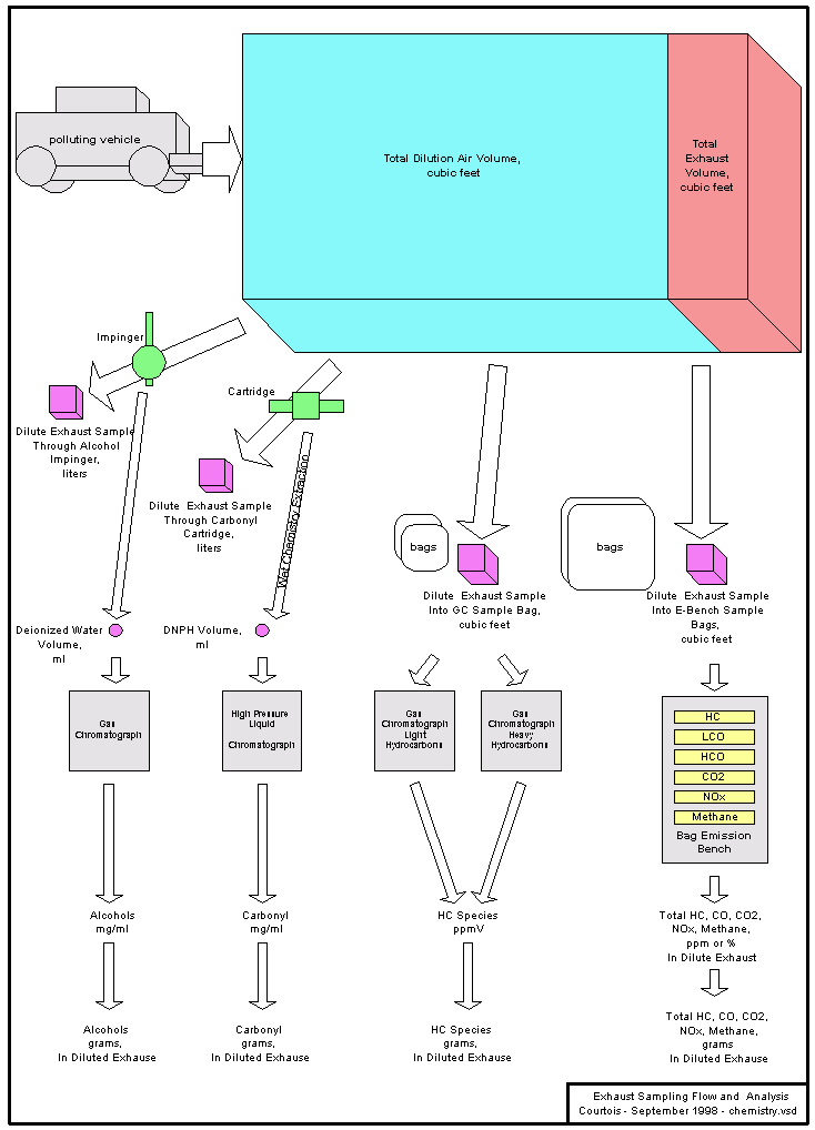 This graphic shows dilution of vehicle exhaust and the flow of emission samples through analytical instrumentation.
