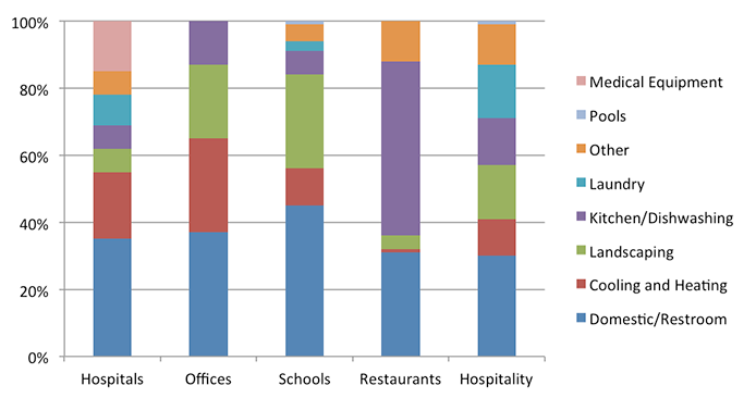 WaterSense also seeks field data on water use in the commercial and institutional sectors and makes this information available on our website. Because there is no one source for this type of information, the program often pulls data from different sources to develop its information. For example, the graphic below from our WaterSense at Work guide was developed by reviewing data from the following sources: