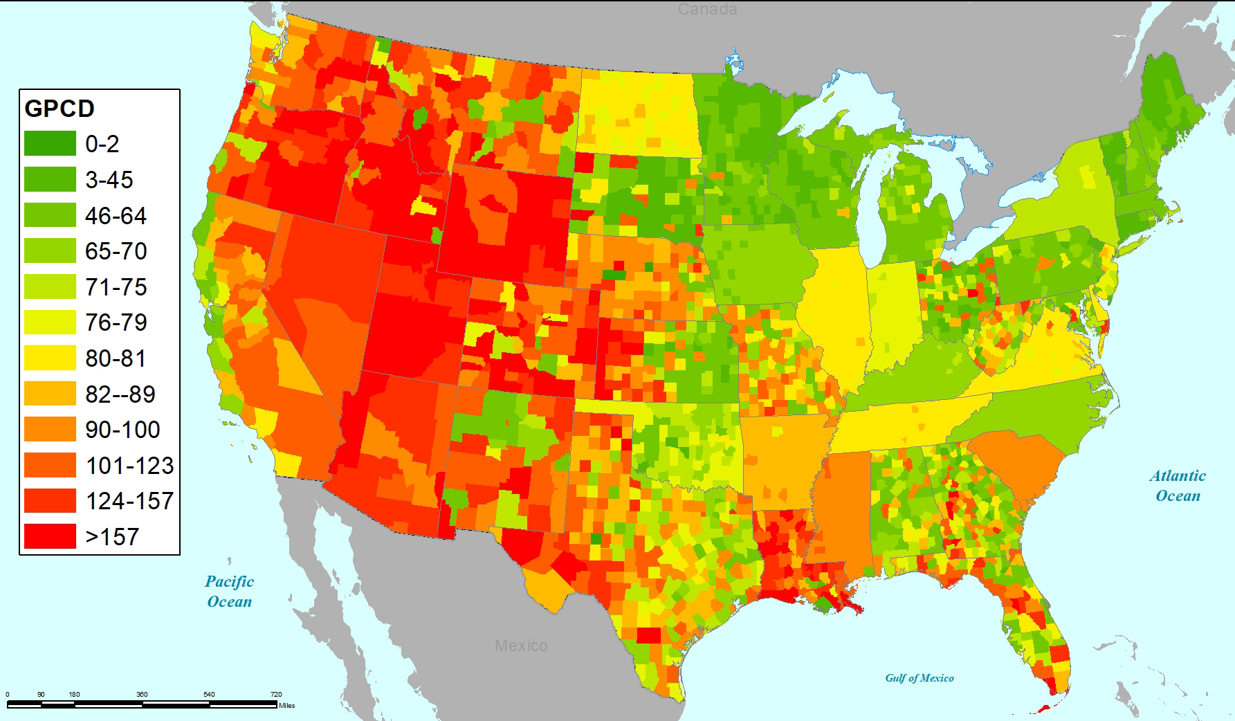 The figure below presents USGS data from the 2015 report highlighting domestic water use by county on a gallons per capita per day (GPCD) basis.