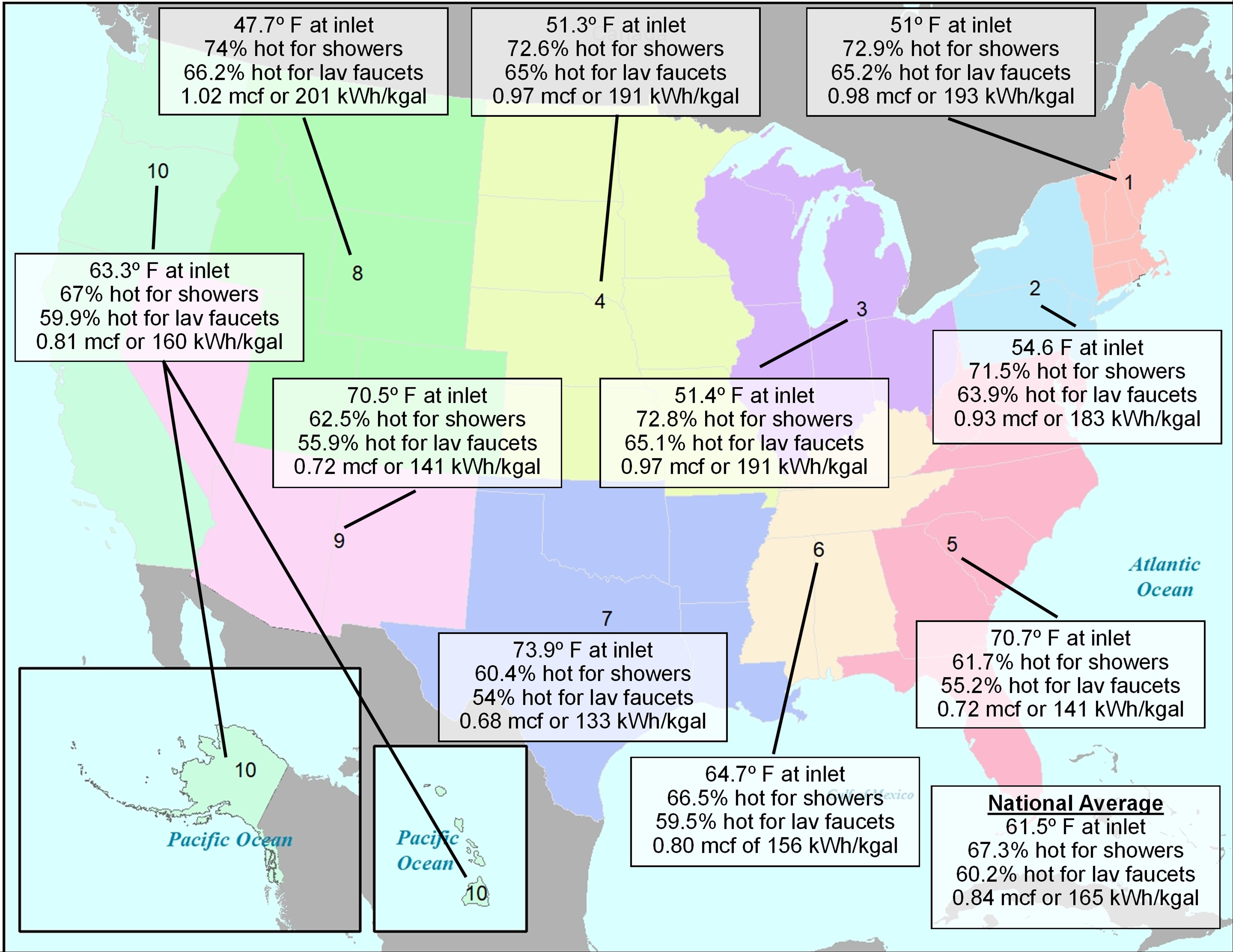 | Census Region | Average Inlet Water Temperature (ºF) | Average Temperature Rise at the Water Heater (ºF) | Average % of Shower Water that is Hot | Average % of Lavatory Faucet Water that is Hot |