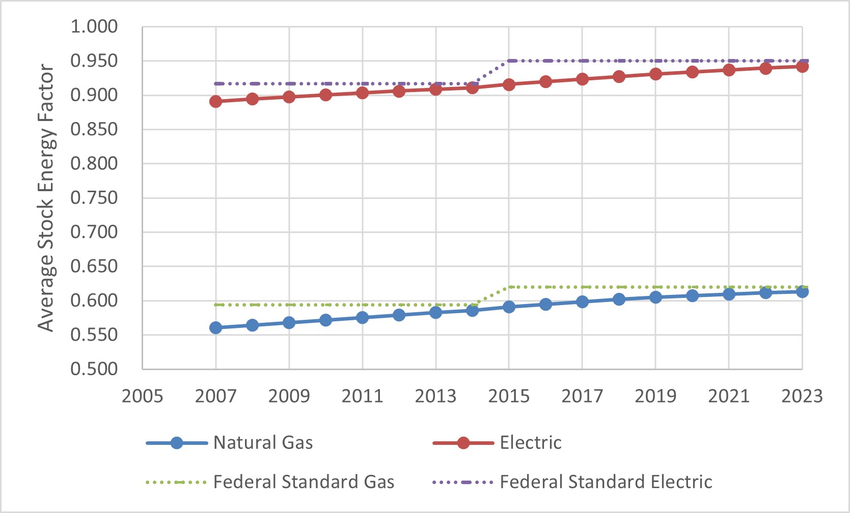 The chart below shows the estimated changes in estimated efficiency relative to federal standards since 2007.