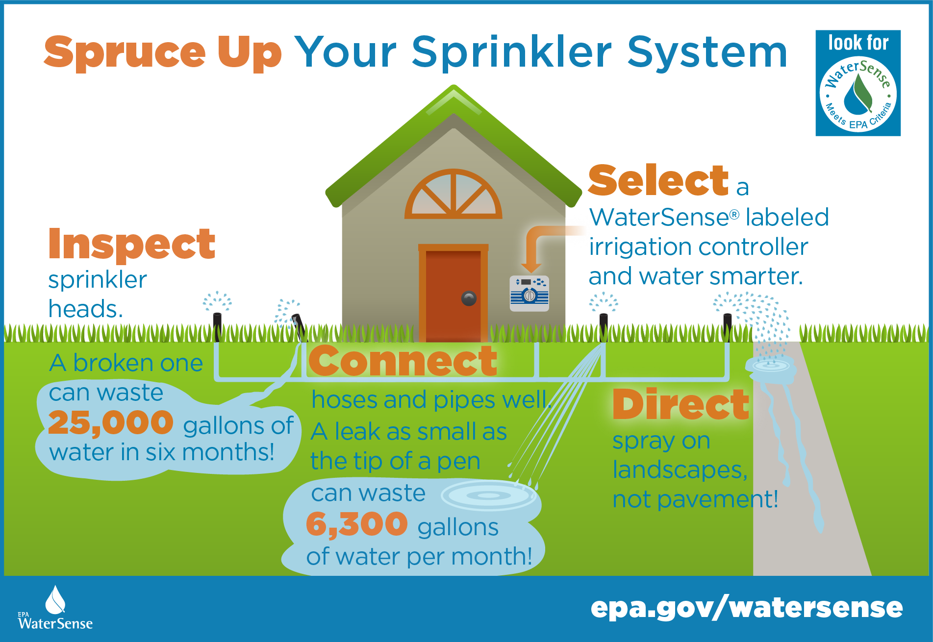 For irrigation tips you can take with you, take a look at our brochure "It’s Time to Start a Sprinkler Spruce-Up!" (2 pp, 2 MB, About PDF). It gives simple instructions to help homeowners check their in-ground irrigation systems. Sprinkler Spruce-Up is not just for spring; regularly check your irrigation system to ensure no water is being wasted.