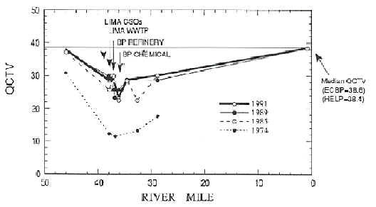 Despite overall improvements, however, severely degraded conditions continued below Lima, where several significant point source discharges are located. These sources include the Lima WWTP, combined sewer overflows (CSO), an oil refinery, and a petrochemical plant. During the period from 1974-1977, results of chemical sampling supported the bioassessment data in showing very poor conditions. Causes of impairment were attributed to ammonia and (to a lesser degree) low dissolved oxygen and elevated chromium levels. Not until the mid-1980s did biosurveys show dramatic biological recovery from conditions observed during the 1970s, largely stemming from reduced loadings of toxic and oxygen-consuming pollutants following implementation of the 1972 Clean Water Act and its amendments. Subsequent bioassessment data showed that slight to moderate improvements continued through 1989. These trends, as indicated by the Qualitative Community Tolerance Value (QCTV), are depicted in the figure. The QCTV is a score based on the median pollution tolerance values of all organisms from sample collected at a site. Lower QCTV scores indicate the presence of organisms that can tolerate degraded conditions.